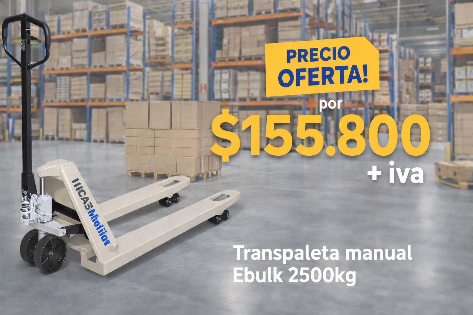Transpaleta manual EBULKCapacidad 2500KgDistancia del centro de carga 400mmAltura de horquilla rebajada 80mmRueda de horquilla 58ø mmAltura máxima de elevación 150mmDimensiones (mm): 50x160x1220Anc...